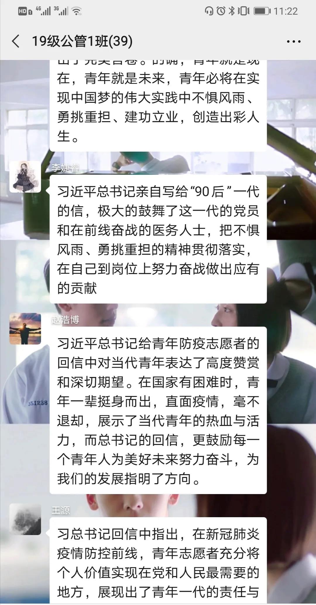 2019级公共管理类1班团支部李婕睿说,习近平总书记亲自写给“90后”一代的信,极大的鼓舞了这一代的党员和在前线奋斗的医务人员,把不惧风雨、勇挑重担的精神贯彻落实,在自己到岗位上努力奋战做出应有的贡献。