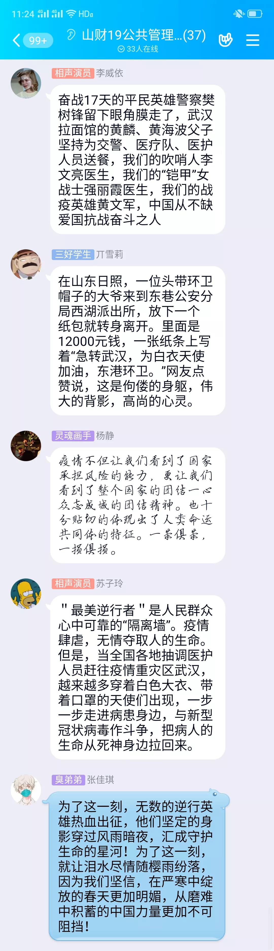 2019级公共管理类2班团支部致敬“最美逆行者”,在班级QQ群中分享多名90后医护人员的工作视频,他们厚重的防护服、脸上护目镜的深刻痕迹,给同学们留下了深刻印象。同学们表示:“哪有什么岁月静好,不过是有人在负重前行。磨难压不垮,奋起正当时,目前,在全球疫情蔓延的当下,处在战“疫”一线的中国,在此次疫情中充分展示了大国的担当,我国的应对措施得到了国际社会的高度赞誉。我们是同呼吸、共命运的命运共同体,虽不能走上抗疫一线,我们大学生也应尽自己的绵薄之力,坚定信心,众志成城,与祖国一起,坚决打赢这场攻坚战!”