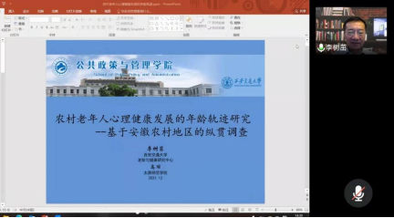(通讯员:李岳)2021年12月23日下午,公共管理大讲堂(第72讲)学术讲座成功举办。西安交通大学公共政策与管理学院教授、教育部“长江学者”特聘教授李树茁,应邀为我院师生做了主题为“农村老年人心理健康发展的年龄轨迹研究”的线上学术讲座。讲座由贾海彦副院长主持,张红凤院长、学院教师及全体研究生参加。
