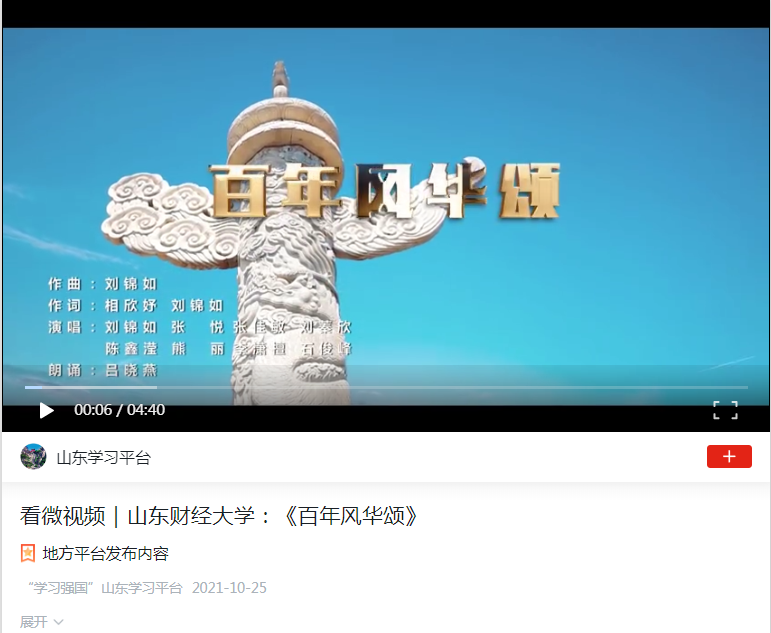 (通讯员于子迅)在庆祝中国共产党成立百年之际,由我院学生创作、学院党委出品的《百年风华颂》原创歌曲MV,荣获“红色经典永流传”全国青少年红色文化传承展示活动高校接力赛一等奖,并荣登中宣部“学习强国”平台,公管学子以原创作品献礼党的百年华诞,以嘹亮歌声传递红色精神,向全国的平台读者展示了我院学生奋发向上的精神风貌。