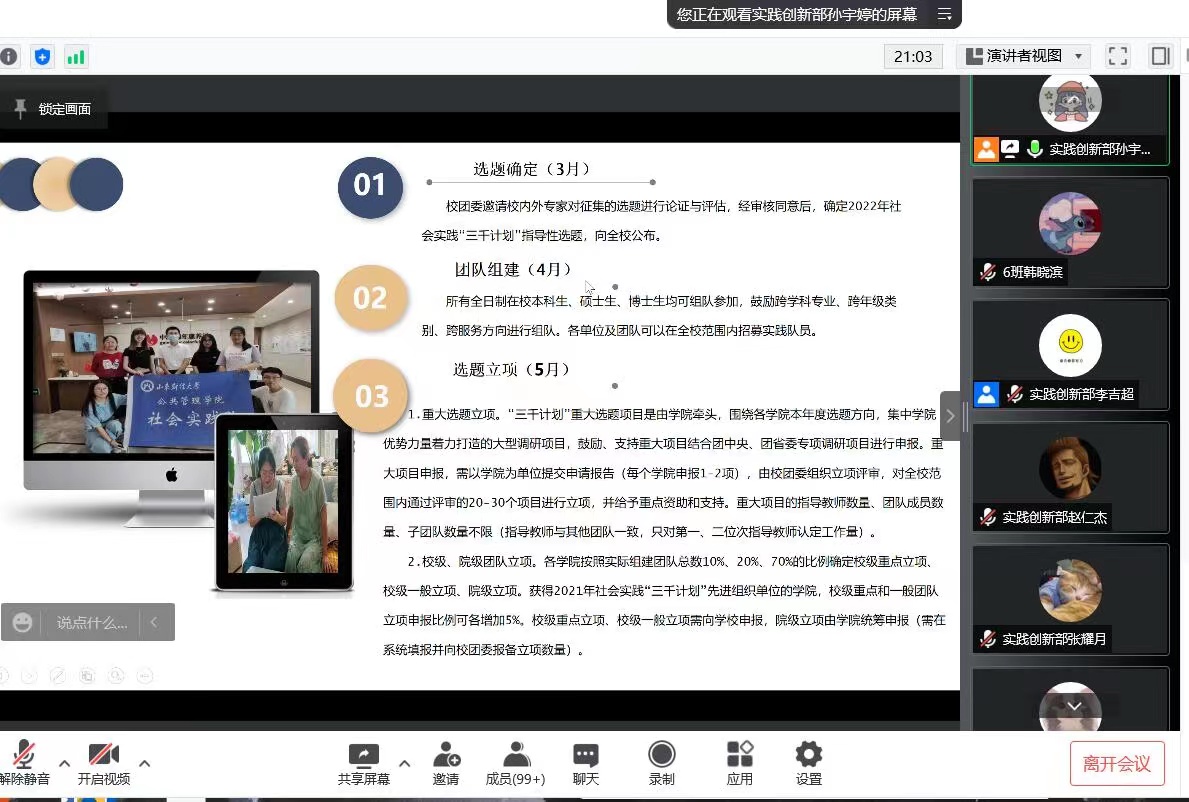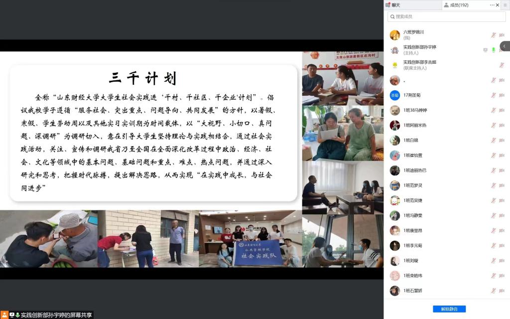 (通讯员 罗锦川)行是知之始,知是行之成。4月14日晚,我院实践创新部通过腾讯会议成功举办“公共管理学院三千计划启动大会”,本次会议由实践创新部部长孙宇婷、副部李吉超同学主讲,全体2021级同学参加。