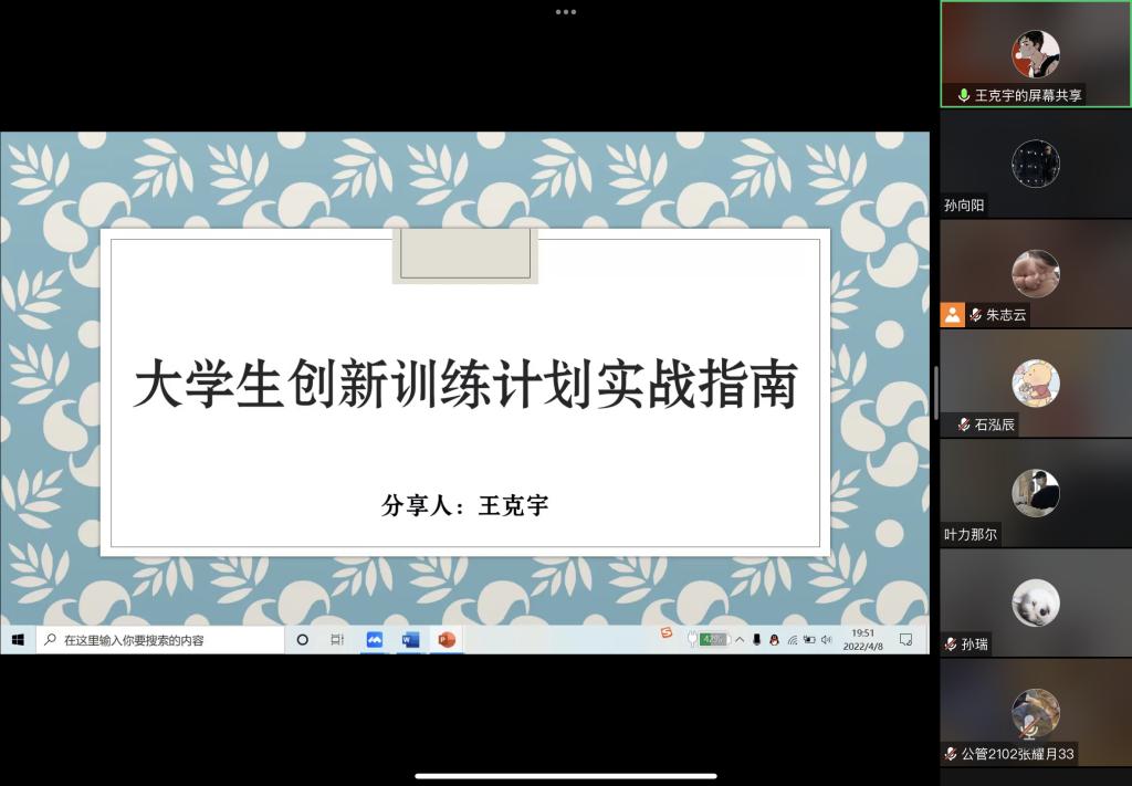 (通讯员 孙向阳)为深化高等教育综合改革成效,激发大学生创新创业能力,4月8日晚7点,我院通过腾讯会议向全院本科学生召开国创分享交流会,会议由科创部部长朱志云主持,劳动与社会保障1901班石泓辰、王克宇主讲。