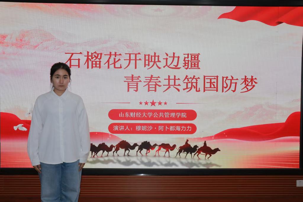 “爱我国防”朗诵比赛则以强化国防意识、弘扬爱国情怀为核心,吸引了众多学子踊跃参与。2024级穆妮沙·阿卜都海力力带来演讲《石榴花开映边疆,青春共筑国防梦》。她以饱满的热情、真挚的情感,描绘出边疆青年投身国防事业的壮丽图景,将个人青春与国防使命紧密相连,诠释了新时代青年的担当与奉献,荣获校级二等奖。