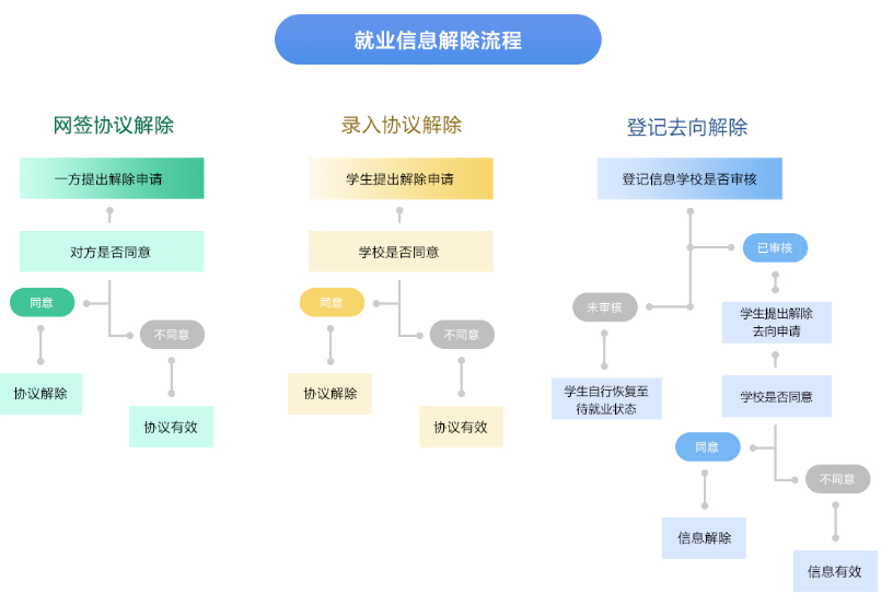 注:毕业生离校派遣后,如网上签约单位,系统在学生应约时可自动解除录入的协议;如录入就业协议(即线下签约),系统在学生提交审核时可自动解除已录入的协议,不再需要学校审核。