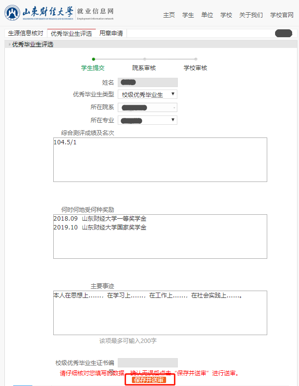 (3)校级优秀毕业生在填写完成后点击保存并送审。