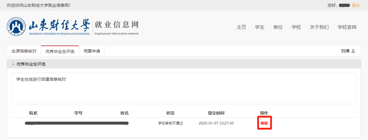 注:若学院在审核时,出现填写错误的情况,双击进入学生编辑页面直接进行修改或审核不通过退回学生自行修改后再提交。