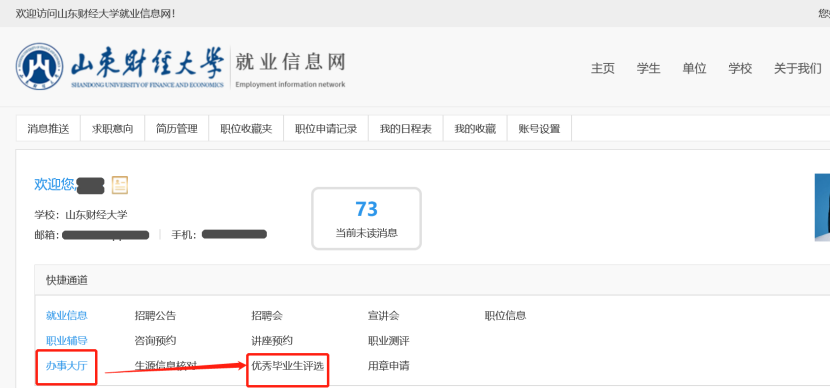 (1)初选学生登录山东财经大学就业信息网(网址:http://job.sdufe.edu.cn/),点击学生登录,选择办事大厅中优秀毕业生评选。