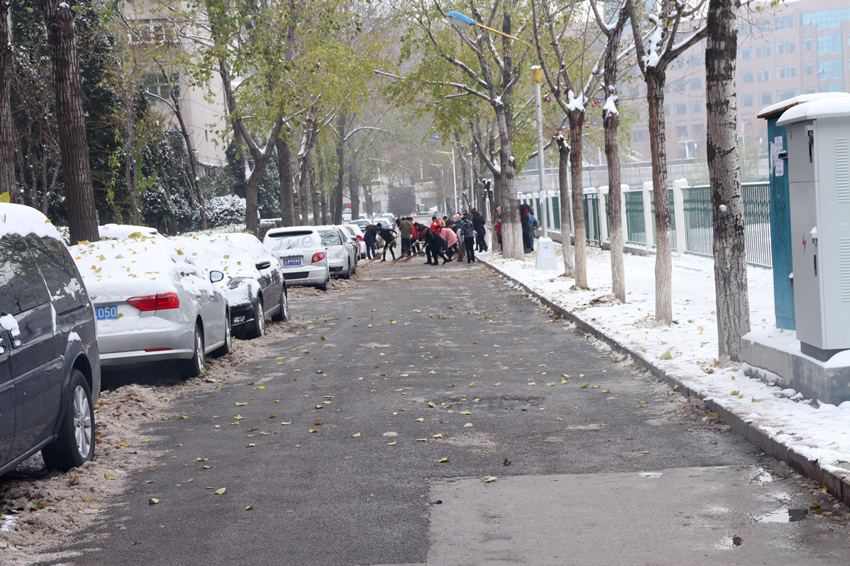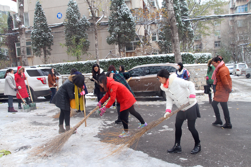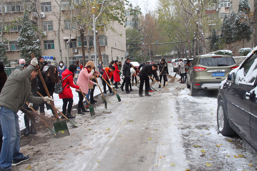 学院教师郑磊、周炎、张禹、徐桂菊、王恩娟、李昭娜、张辉、热依拉、路军和我院2013级劳动与社会保障专业3班本科生、2014级研究生张焕、2015级部分研究生踊跃参加了此次东区卫生区的清冰扫雪工作。