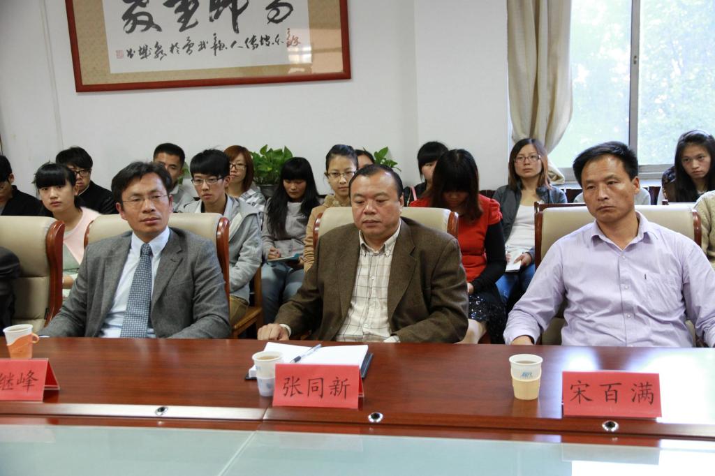 2013年10月15日下午,“民企业家、泰山学者谈成才与创业之路”座谈会暨校外创业导师聘任仪式在我院308会议室召开。张同新、宋百满、刘继峰三位嘉宾,公共管理学院全体领导,2013级研究生以及部分本科生参加了本次大会。座谈会由李国锋副院长主持。