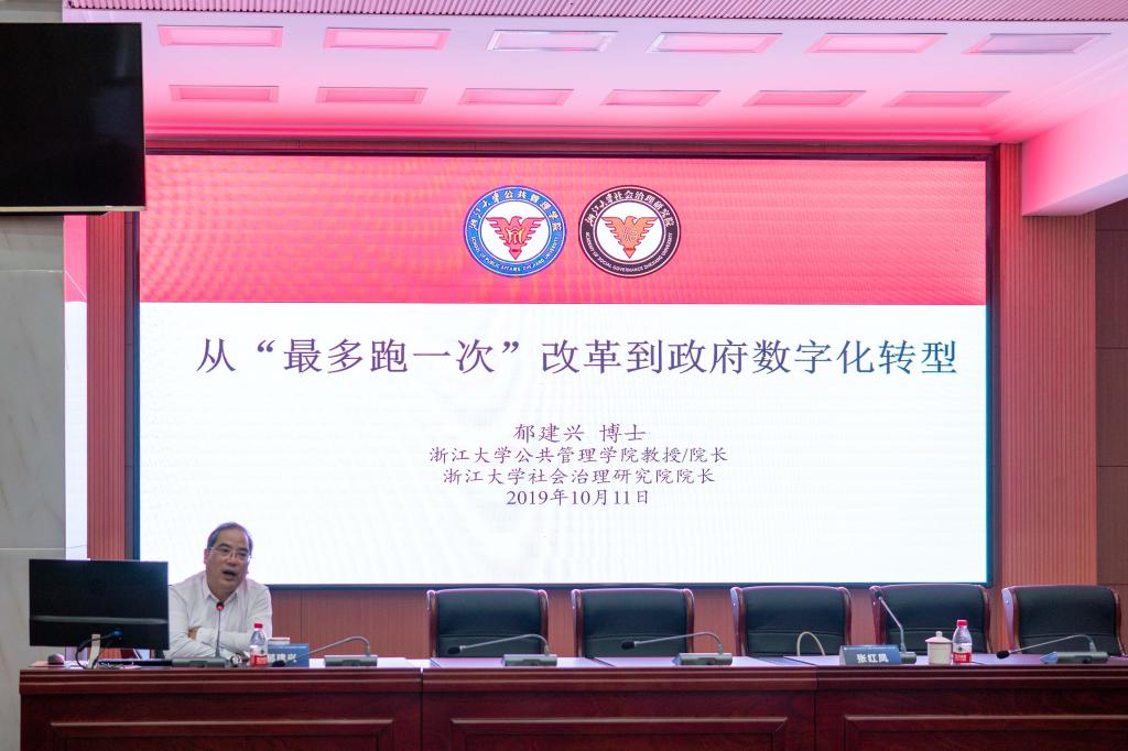 开幕式结束后举行了主题报告,教育部高等学校公共管理类专业教学指导委员会秘书长兼浙江大学公共管理学院院长郁建兴教授发表主题为:从“最多跑一次”改革到政府数字化转型的演讲,他阐述了“最多跑一次”改革是践行“以人民为中心”发展思想的具体行动,是公共管理人追求深化改革的要求,通过政府数字化转型能够提供政府工作效率和服务水平。