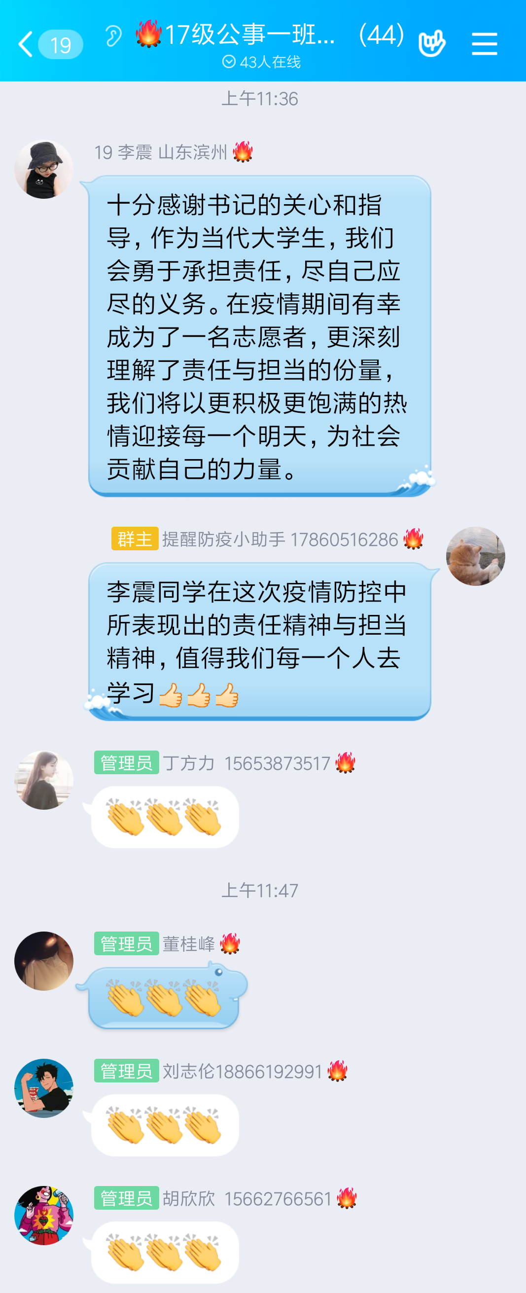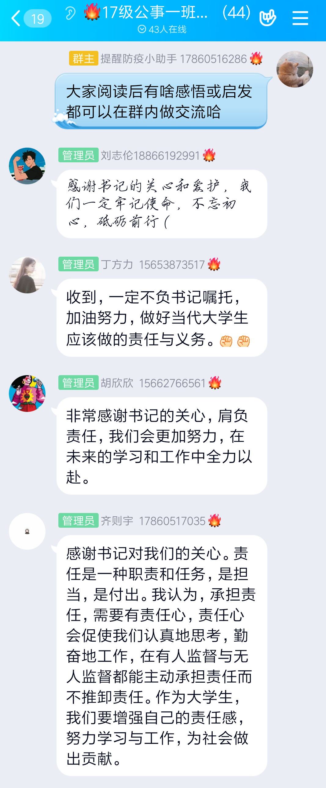 (通讯员 王梦圆)4月6日,我院2017级公共事业管理一班全体同学致信学院党委书记李国强,对疫情期间李书记对同学们的关怀致以由衷的敬意和感谢,并结合疫情防控就大学生应如何肩负起新时代的责任与担当表达了自己的见解,希望得到李书记的指点。