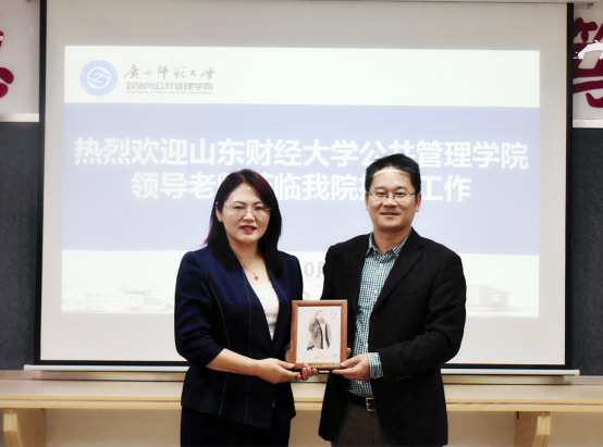 张红凤院长代表学院向肖富群院长赠送了富有山东特色的文化礼物,感谢广西师大政管学院对我院一行的热情接待,同时诚挚邀请肖富群院长等学院领导和老师访问山东财经大学公共管理学院,推动双方深度交流与合作。