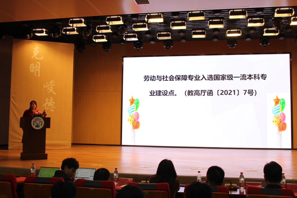 会议伊始,由徐宏对劳动与社会保障专业进行相关介绍。她从该专业基本情况、师资队伍、学生能力培养、就业情况等方面展开具体说明,就大类专业分流整体情况进行介绍,并指出培养通晓中外劳动关系管理和社会保障理论与实务的应用复合型公共管理人才的专业定位,并对大学生提出自我规划、自我学习、自我管理、自我提升的素质要求。