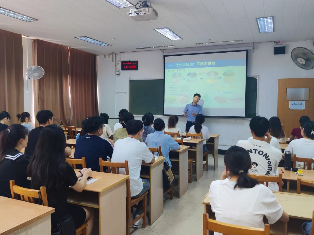 曲老师首先从二十大报告中耕地保护相关论述出发,带领研究生党员学习习近平总书记从2013年到2022年关于耕地保护的重要讲话,以《论“三农”工作》中关于耕地保护和粮食安全论述为依据,点明耕地作为“铁饭碗”“压舱石”“稳定器”“底气牌”的重要意义。接着,曲老师以“国之大者”为中心,以“18亿亩耕地红线”“大熊猫”“命根子”“黑土地保护”等关键词为落脚点,描述了耕地保护的重要性。最后,曲老师结合国家战略背景和自己的研究工作,从“什么是耕地、为什么保护耕地、保护多少耕地、保护什么样的耕地、怎样保护耕地”五方面进行详细的讲解,强调学生党员们要深刻理解习近平总书记的国家安全观,不断从习近平新时代中国特色社会主义思想中汲取力量,坚持以学铸魂、以学增智、以学正风、以学促干,做到“学思想、强党性、重实践”,不断努力成为一名优秀的共产党人。