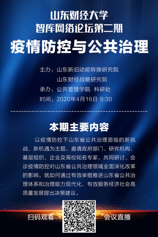 以疫情防控下山东省公共治理面临的新挑战、新机遇为主题,邀请政府部门、研究机构、基层组织、企业及高校知名专家,共同研讨、会诊疫情防控对山东省公共治理领域全面深化改革的影响,就如何通过有效举措推进山东省公共治理体系和治理能力现代化、有效服务经济社会高质量发展提出决策建议。