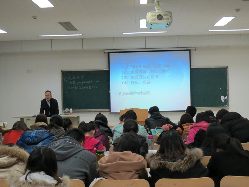 李乐老师从大学生求职技巧和常见的面试形式等几个方面讲解了大学生如何求职应聘。在讲座中他强调到,作为应聘者必须要学会调整自己的心态,学会毛遂自荐,学会推销自己,要充分把握就业展现的每次机会。对于如何能在第一次面试时给用人单位留下好印象,李老师谈到要沉着冷静,逻辑清晰,学会领会面试官的意图等。同时李老师就常见的几种面试形式进行了阐述并提供了应对方法。随后,李老师与同学们进行了互动交流,解答了同学们在应聘方法上的疑问。