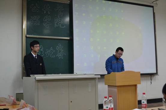 12月16日下午6:30,由公共管理学院学习部主办的辩论赛决赛在明水校区1104举行。辩论赛邀请了公共管理学院学生会主席王彦国,副主席王哲、张瀚丹、孙中奇,秘书长姜婷,学习部部长马腾,副部长郭欣雨等担任嘉宾,由11级辩论赛主席张鸿越以及部分骨干成员担任评审,并由纪检部成员组成公证小组。