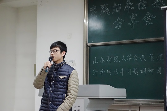 分享会由实践创新部副部长张耀政主持,他首先向同学们介绍了学校暑期社会实践活动“三千计划”的具体内容。随后,李恺鑫介绍了“城风团队”对济南网约车问题的调研情况,利用视频展示了“城风团队”整个社会实践过程,并围绕着“济南网约车问题”讲解了调研团队跟随网约车调研过程中遇到的困难和经历感受,阐述了实践活动的意义,分享了成员们集体合作的快乐。闫梦真和姜冲分别介绍了团队对“阳信县精准扶贫项目绩效”、“烟台市农村饮用水安全问题”的调研的情况,与同学们分享了调研过程中为克服语言障碍、居住问题所做出的努力以及村民们对调研活动的支持所感受到的温暖。三位队长通过精心制作的PPT课件,向同学们详细的讲解了组建队伍、确定课题、立项策划、实地调研、导师指导、调研报告的撰写等实践调研过程。分享了实践活动中的收获,通过自身体验向新生们提出了改进意见和建议。活动最后,我院学生会副主席庄众心作了归纳总结,讲明了社会实践活动对大学生学习、生活和工作上的促进作用。