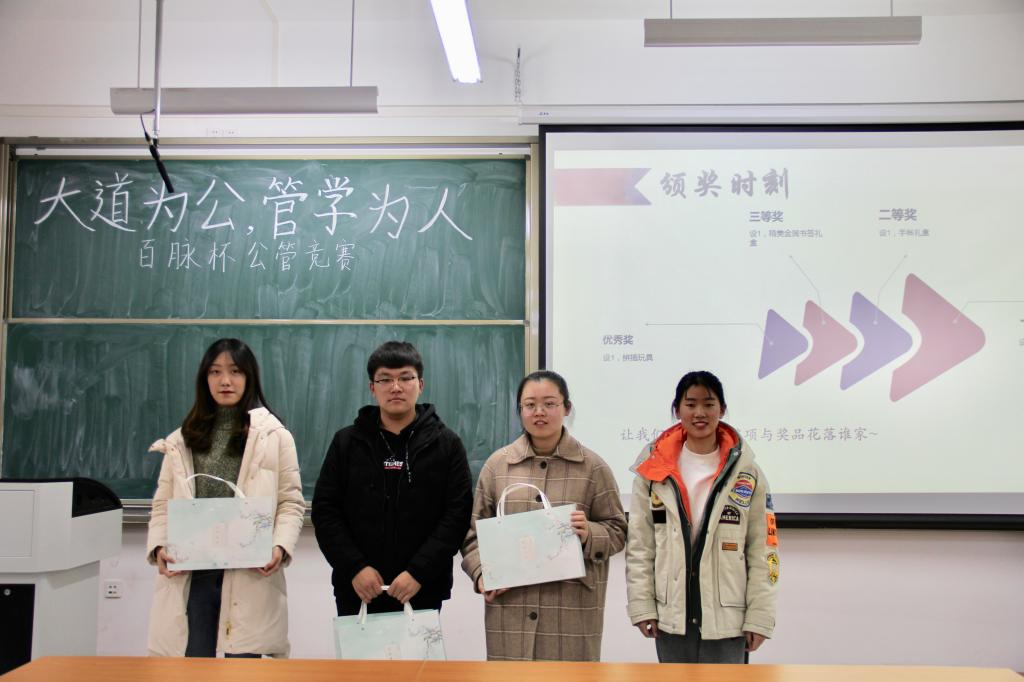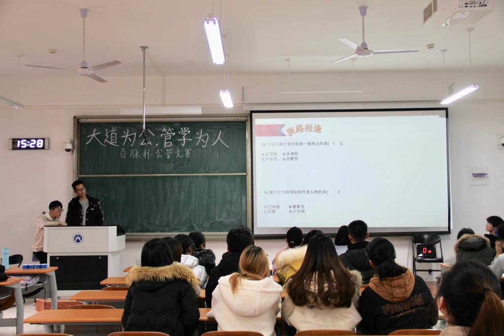(通讯员 鲁宇航 秦文煊 摄影 谭诚 李想)12月5日下午2点,由山东财经大学学生会与公共管理学院学生会共同举办的“百脉杯”学科知识能力竞赛——“大道为公,管学为人”公共管理知识竞赛在圣井校区8208举行决赛。山东财经大学学生会副秘书长张洲荃,公共管理学院学生会副主席马一鸣出席了本次比赛。