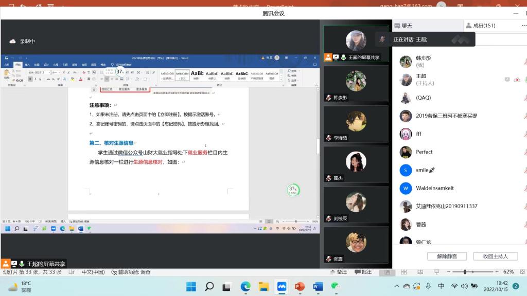 随后,王超对2023届生源信息录入工作进行讲解,从学生注册、登录、信息录入以及注意事项四个方面分别为大家进行了详细讲解,同时强调了就业推荐表填写的注意事项。