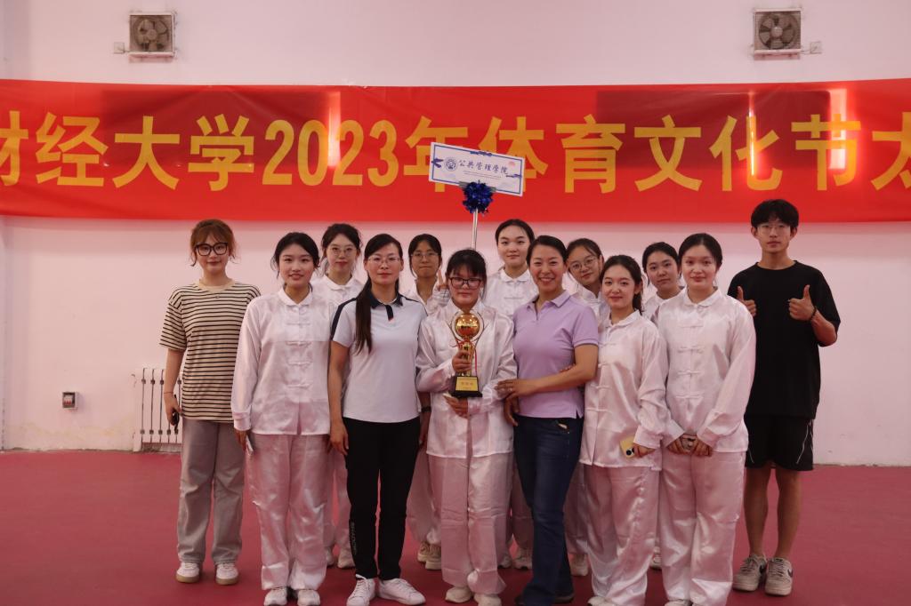 比赛开始,各学院按抽签顺序依次上场,公共管理学院代表队作为第三个队伍上场。队员们按照3×3的队列上场,面向评委席中间,以特殊队形散开,站定,向观众和评委敬礼。随着音乐响起,队员们入境放松,展示了急缓相间,行云流水的太极拳术,意、气、形、神逐渐融为一体,可谓“妙手一运一太极,太极一运化乌有”。经过评委打分,学院获得团体“第四名”的好成绩,孙欣宜获“最佳个人奖”。