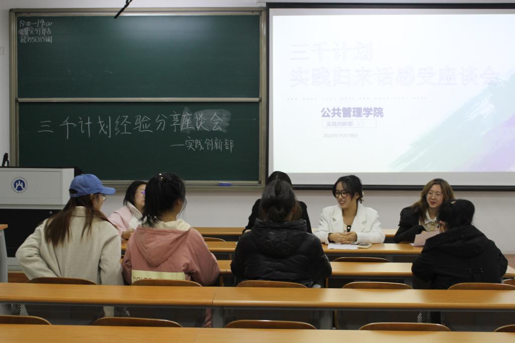 (通讯员 张敏 摄影 田怡帆)11月18日晚,公共管理学院在圣井校区8-108教室召开了第二次“三千计划”经验分享座谈会,此次由三支校重点团队和一支校级一般团队进行团队间社会实践经验交流与分享。此次座谈会由学院学生会实践创新部主持,实践创新部成员参加。