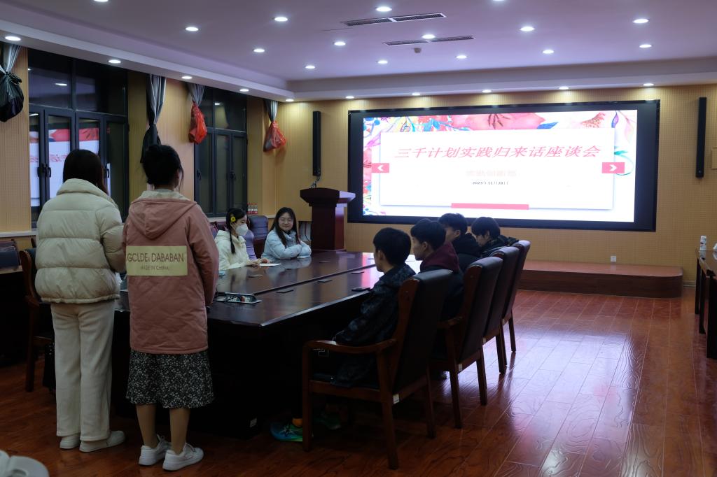 (通讯员 张敏 摄影 何叶)为深化同学们对“三千计划”实践活动的理解,进一步激发他们参与实践活动的热情,11月28日,学院于圣井校区8-128教室召开了“三千计划”实践归来话座谈会。本次座谈会由院学生会实践创新部主持,“三千计划”团队队长及成员参加。