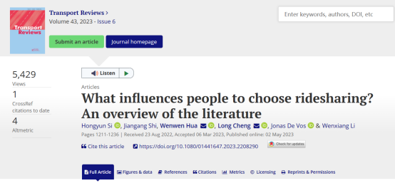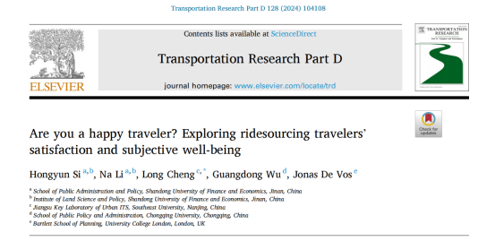 近日,司红运副教授以第一作者完成的2项成果发表在交通领域权威期刊。其中,与硕士研究生李娜等合作撰写的论文“Are you a happy traveler? Exploring ridesourcing travelers' satisfaction and subjective well-being”发表在Transportation Research Part D: Transport and Environment;与来自同济大学、东南大学等高校合作者撰写的论文“What influences people to choose ridesharing? An overview of the literature”发表在Transport Reviews(领域顶尖)。两期刊均属我校A1类。