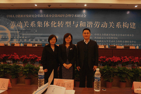 由中国人力资源开发研究会劳动关系分会主办,西南政法大学管理学院、西南政法大学劳动社会保障法制研究中心及西南政法大学人力资源管理与劳动法制研究中心承办的“劳动关系集体化转型与和谐劳动关系构建——中国人力资源开发研究会劳动关系分会第5届年会暨学术研讨会”于2012年11月24日-25日在重庆召开。我院张红凤院长应邀带队参会。