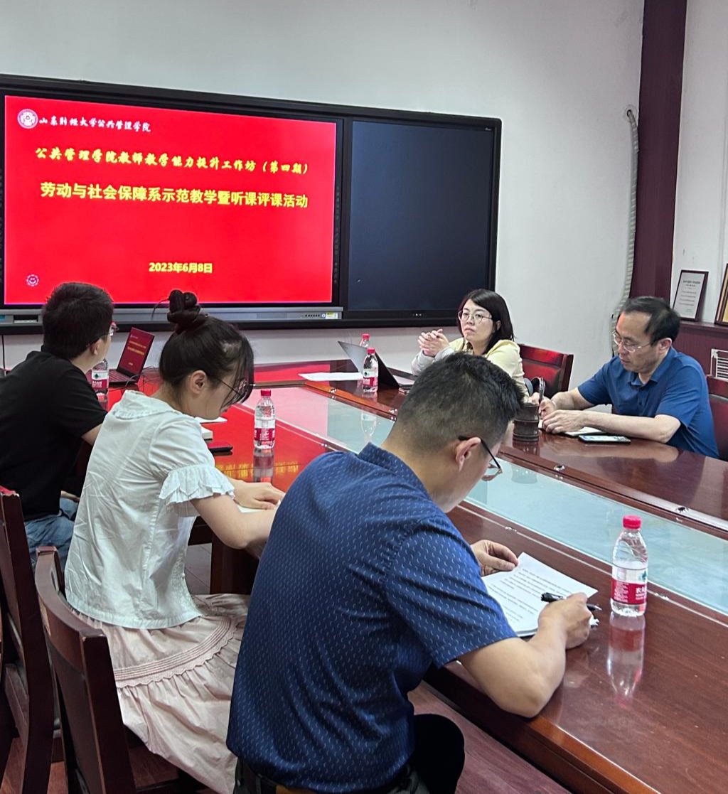 6月8日下午,公共管理学院教师教学能力提升工作坊(第四期)成功举办。本次工作坊的主题为“劳动与社会保障系示范教学暨听课评课活动”。学院党委书记张建、劳动与社会保障系主任徐宏及各专业教师代表参加,劳动与社会保障系副主任刘玉安主持。