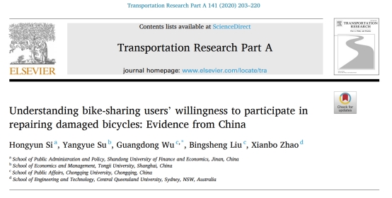 我院青年教师司红运作为第一作者撰写的论文《Understanding bike-sharing users’willingness to participate in repairing damaged bicycles: Evidence from China》于2020年11月在期刊《Transportation Research Part A: Policy and Practice》第141卷发表。该期刊(简称TRA)为ABS三星,FMS A级,SSCI 1区,系我校特类期刊。
