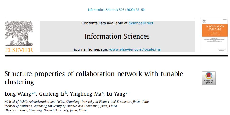 我院青年教师王龙博士与统计学院李国锋教授等合作撰写的学术论文《Structure properties of collaboration network with tunable clustering》于2020年1月在《Information sciences》期刊506卷上发表。该期刊为我校特类期刊(SCI,IF:5.524)。