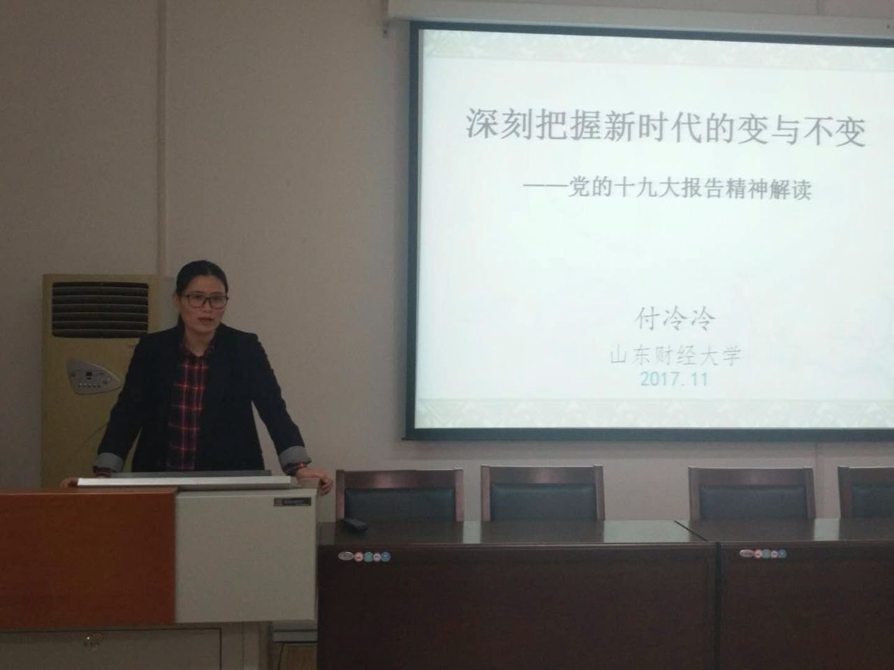 (通讯员 周昊声)为深入学习和践行十九大精神,帮助同学们领会和把握十九大提出的“新时代”的真正含义,11月16日下午,在学院党委的安排部署下,行政管理系副教授付冷冷以“深刻把握新时代的变与不变”为题,举办了一场深入浅出、意义深刻的十九大报告解读讲座。讲座由党委秘书李昭娜老师主持,公共管理学院全体学生党员、预备党员以及党员发展对象收听了讲座。校党委组织部杨景波部长和我院党委书记郑磊亲临现场。