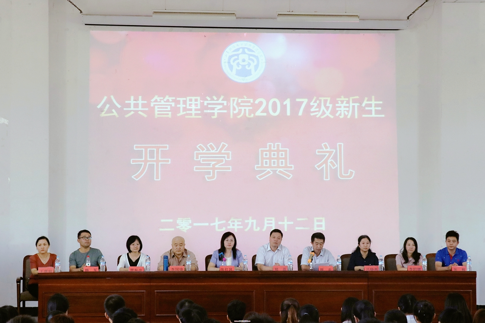 (通讯员 李昭娜 赵富荣 )2017年9月12日上午10:00,我院2017级本科生开学典礼在明水校区5201举行。院长张红凤,党委书记郑磊,副院长李国锋、贾海彦,党委副书记周炎、吕晓燕,劳动与社会保障系主任路军,团委书记王恩娟,辅导员李昭娜、张辉出席,2017级全体新生以及2016级部分同学代表参加了开学典礼。会议由党委副书记周炎主持。