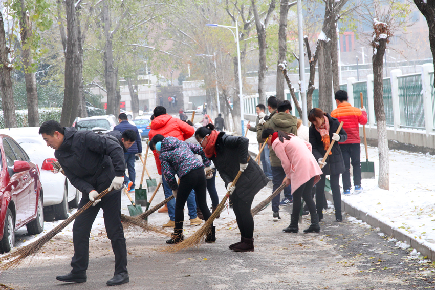 学院教师郑磊、周炎、张禹、徐桂菊、王恩娟、李昭娜、张辉、热依拉、路军和我院2013级劳动与社会保障专业3班本科生、2014级研究生张焕、2015级部分研究生踊跃参加了此次东区卫生区的清冰扫雪工作。