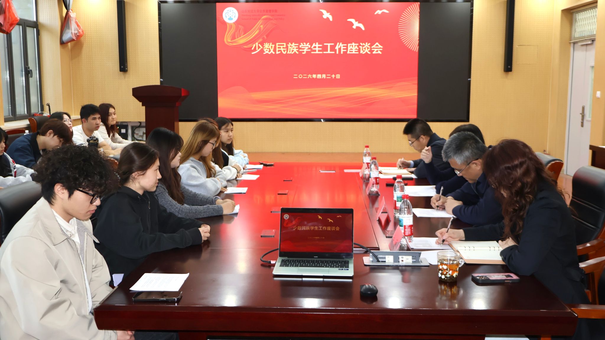(通讯员 张晓慧)4 月 20 日,公共管理学院在章丘校区召开少数民族学生工作座谈会。学院党委书记田远、院长贾海彦、党委副书记许薇、副院长罗微,学院辅导员及 17 名少数民族学生代表参加。会议由许薇主持。