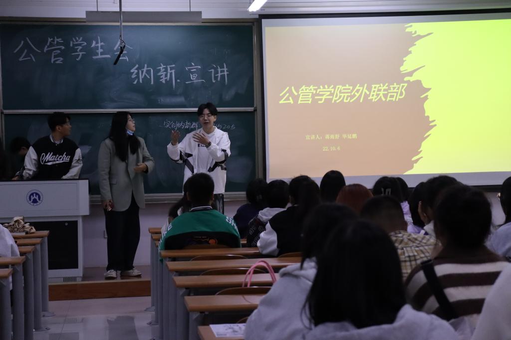 (通讯员 罗锦川 摄影 周蓝梦)10月6日晚,公共管理学院本科学生会宣讲会于圣井校区8-110、8-112、8-210、8-212教室顺利举行。此次会议由学生会主席团成员主持,学生会各部门学生骨干、新生代班与2022级全体新生参加。