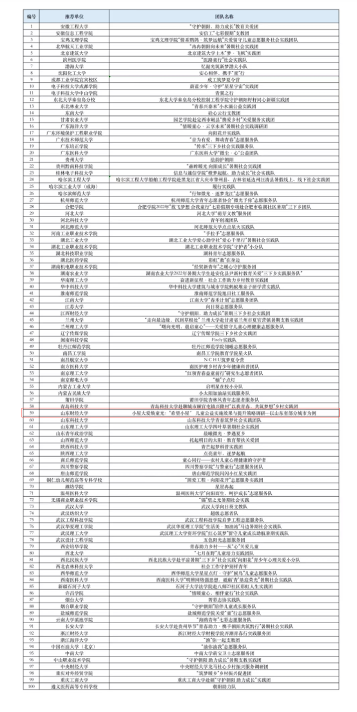 (通讯员 王嘉彤 沙舒欣)7月12日,中国社会工作联合会青少年与学校社会工作委员会公布了“守护朝阳 助力成长”三下乡社会实践专项活动成功入选的队伍名单。我校公共管理学院“小屋大爱焕童光:‘希望小屋’儿童公益实施效果与提升策略调研——以山东省部分城市为例”团队成功入选。