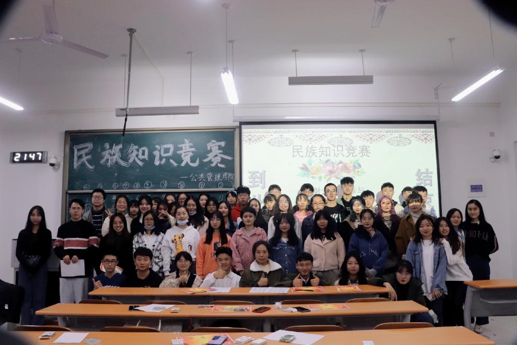复赛分两个环节进行。第一环节,每组派出一名代表参与“踩气球”游戏,抢夺复赛第二环节的“免扣分卡”,现场气氛十分活跃,台上台下欢声笑语不断。第二环节分两轮进行,第一轮采用记分制,参赛队在规定时间内轮流答题,共120道题,采用黑板正字计分。各队集思广益、团结协作,大声喊出自己心中的答案,彰显了公管学子的自信风采,台下更是掌声雷动,将比赛气氛推向高潮;第二轮采用扣分制,以抢答方式进行。比赛立即进入白热化阶段,由于抢答环节各组成员竞争激烈,难于统计,主办方临时调整比赛规则,改为和第一轮相同的轮流作答方式,但同学们依旧热情不减,积极答题。最终行政管理20191班、劳动与社会保障20181班以及行政管理20192班的同学,他们凭借丰富的知识储备、默契的配合以及稳中求胜的策略突出重围,获得了一等奖,领到了民族事务发展部颁发的奖品,其他入围队伍获得了优秀奖。比赛结束后所有参赛人员和工作人员拍照留念。