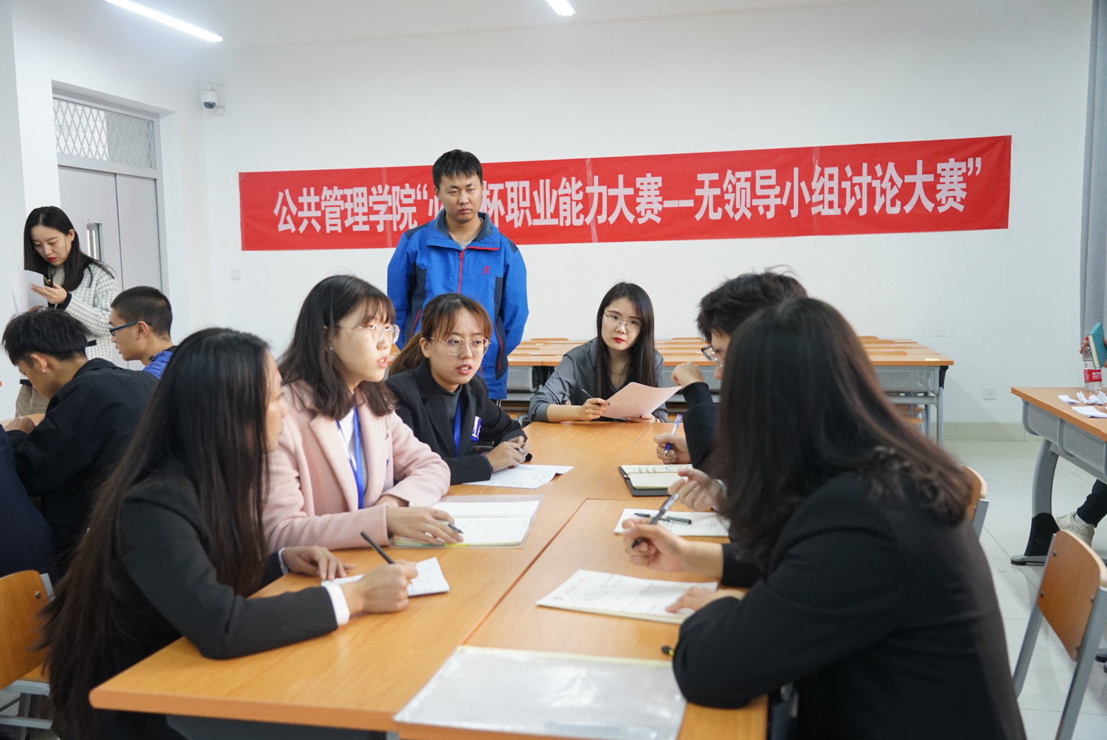 在无领导小组讨论比赛中,每位成员都展现了自己的最佳状态。四组选手在讨论环节积极发言,集众人之智凝聚出色成果。在听取各组讨论结果之后,评委老师对讨论和发言的过程进行了点评并提出了相关建议,选出了12名优秀的同学进行复赛。经过新一轮的激烈竞争,最终评选出优胜选手并颁发奖励。
