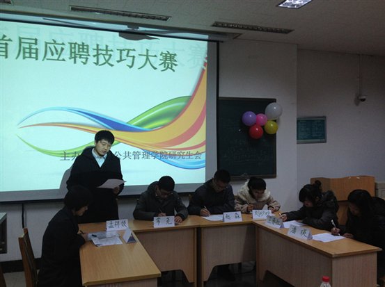 (通讯稿 研究生会宣传部) 12月5日晚7点,由公共管理学院主办,研究生会承办的“首届应聘技巧大赛决赛”正式举行,来自山东浪潮集团人力资源部的宋宏伟、鲁银投资集团的经济师李乐以及山东航空人力资源专家赵永军和鲁商集团的刘朝立担任了本次大赛的评委,参赛报名人员面向学校的全体研究生。