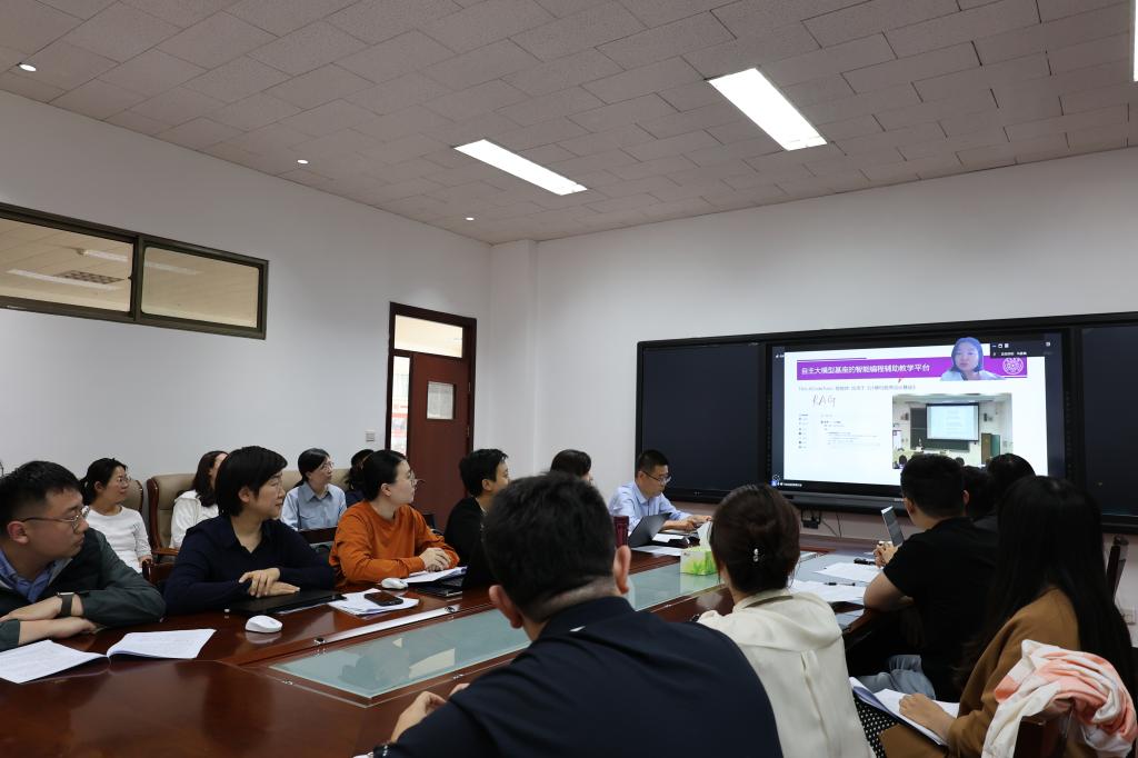 首先,老师们共同听取了清华大学计算机系马昱春教授主讲的以“AI赋能课程做法和案例分享”为主题的线上报告。马教授详细解读了AI在辅助教学领域的发展背景,并强调了其对于提升教育质量的积极作用。同时结合丰富的实际案例,深入剖析了AI在课程设计、教学方法和题目建设等关键教学环节的具体应用,展现了AI技术为教育教学带来的创新与变革。马教授提出,未来应将教学资源、AI编程教学助手与课堂讲授三者有机融合,以推动教学工作提质增效。