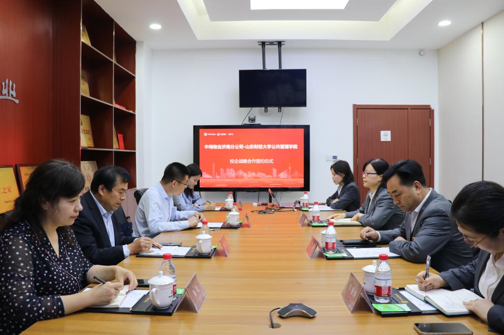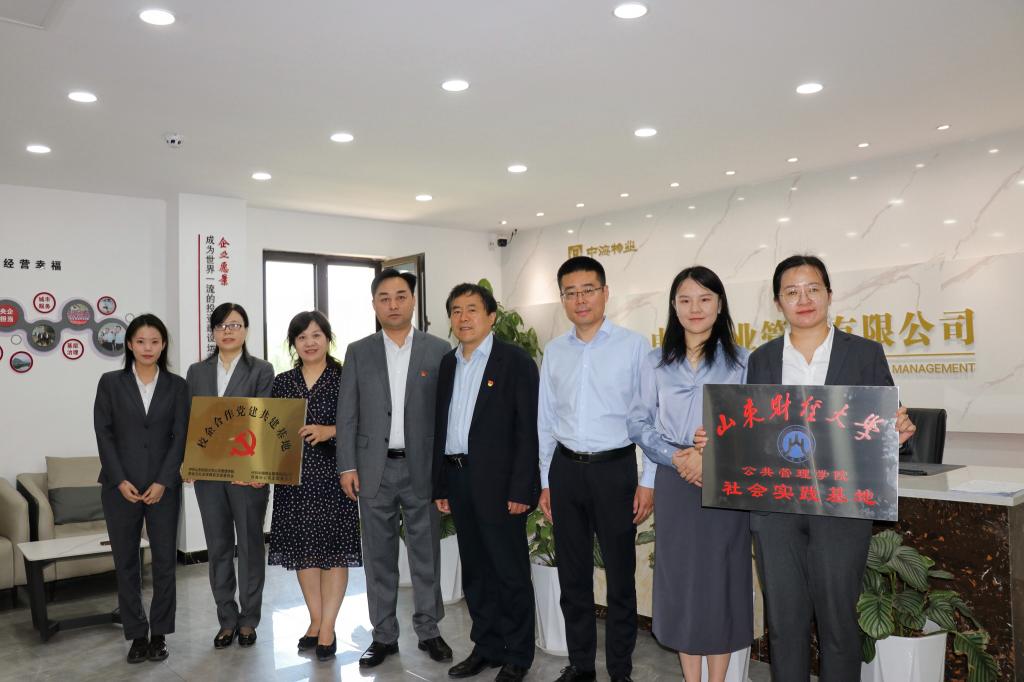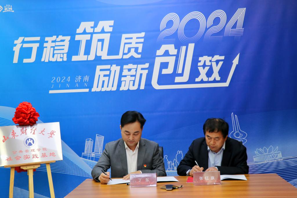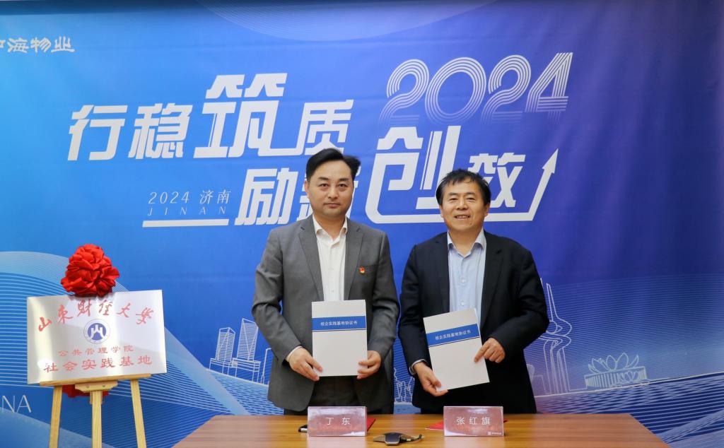 (通讯员 韩步彤)5月15日上午,山东财经大学公共管理学院大学生社会实践基地、党建共建签约暨揭牌仪式在中海物业济南分公司举行。出席本次签约仪式的有公共管理学院党委书记张红旗、副院长罗微、劳动与社会保障系系主任徐宏、就业办主任韩步彤,以及中海物业山东区域公司总经理丁东、人事行政部经理弓清文、财务资金部经理闫丽萍、山东区域招聘负责人张立超。签约仪式由中海物业山东区域人事行政部经理弓清文主持。