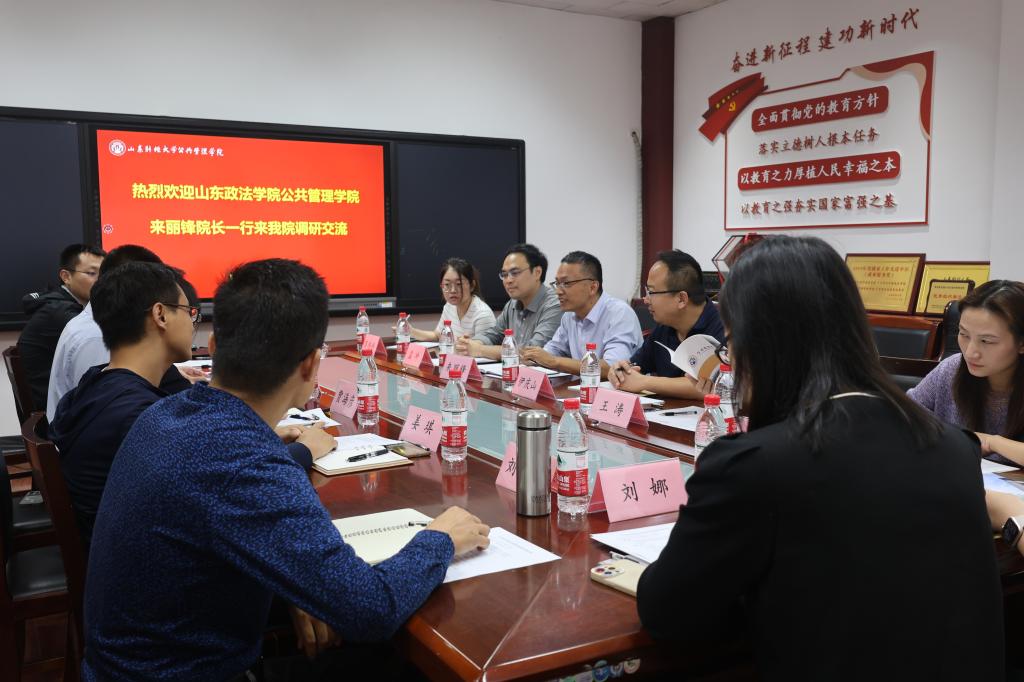 9月26日下午,山东政法学院公共管理学院院长来丽锋、副院长伊庆山、孟冲等一行来我院调研交流。院长贾海彦、副院长罗微、姜琪、政府管理系主任邹涛、社会保障系副主任刘玉安、城市与土地资源管理系副主任司红运参加座谈。