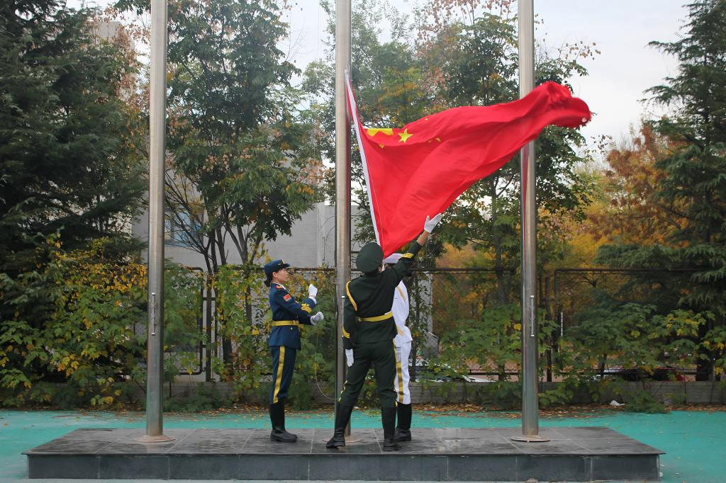 七时整,升国旗仪式正式开始。歌曲《红旗颂》响起,国旗护卫队手握钢枪,护送鲜艳的五星红旗走向升旗台,在庄严肃穆的国歌中,国旗冉冉升起,全体师生齐唱国歌并行注目礼。