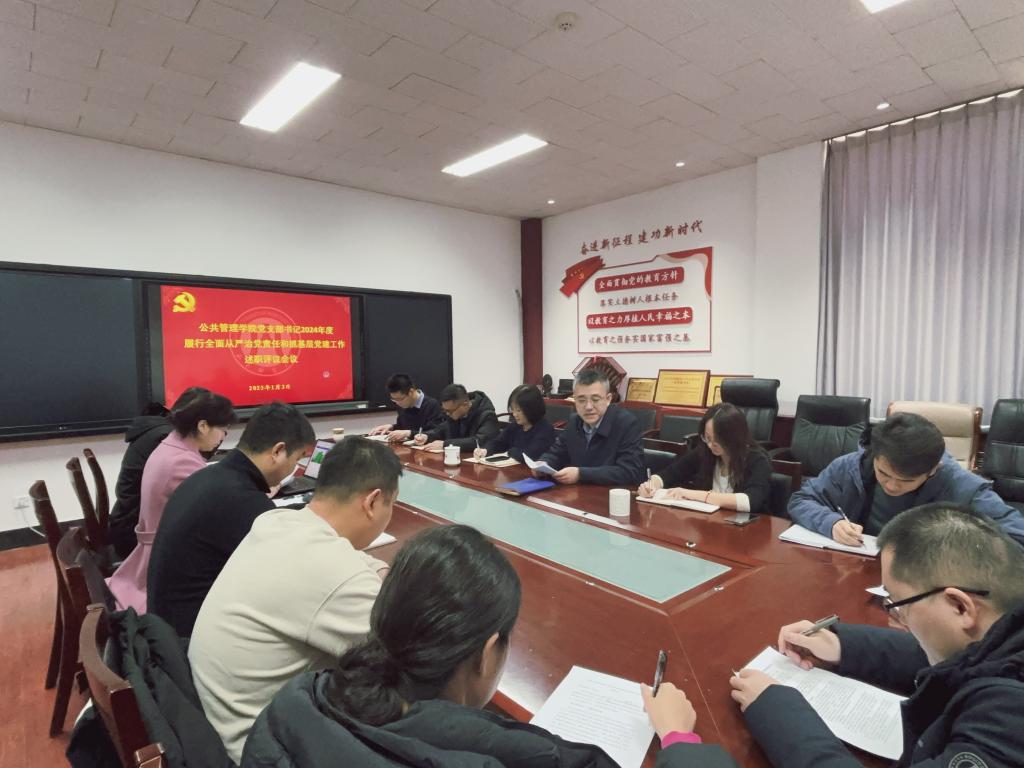 为深入学习贯彻习近平新时代中国特色社会主义思想和党的二十届三中全会精神,推动全面从严治党向基层延伸,促进党支部标准化、规范化建设,1月3日上午,公共管理学院党委召开2024年度党支部书记履行全面从严治党责任和抓基层党建工作述职评议考核会议。学院党委书记田远,党委副书记、院长贾海彦,党委副书记许薇,副院长罗微、曲衍波、姜琪和全体党支部书记参加会议。会议由田远主持。