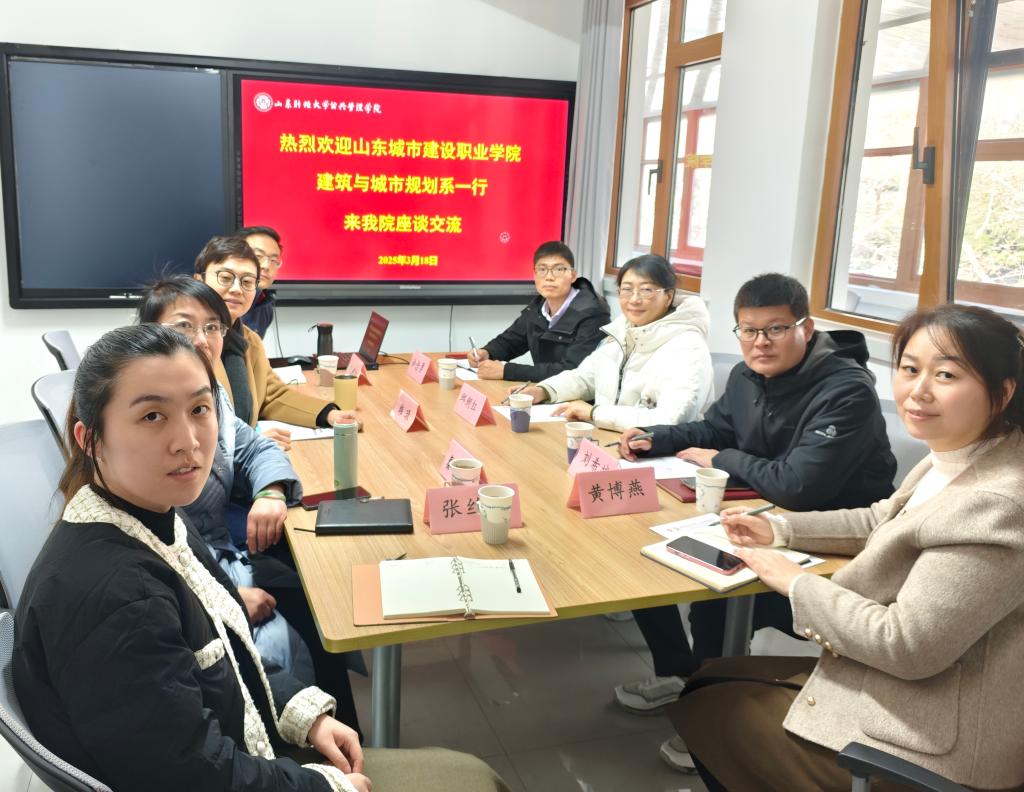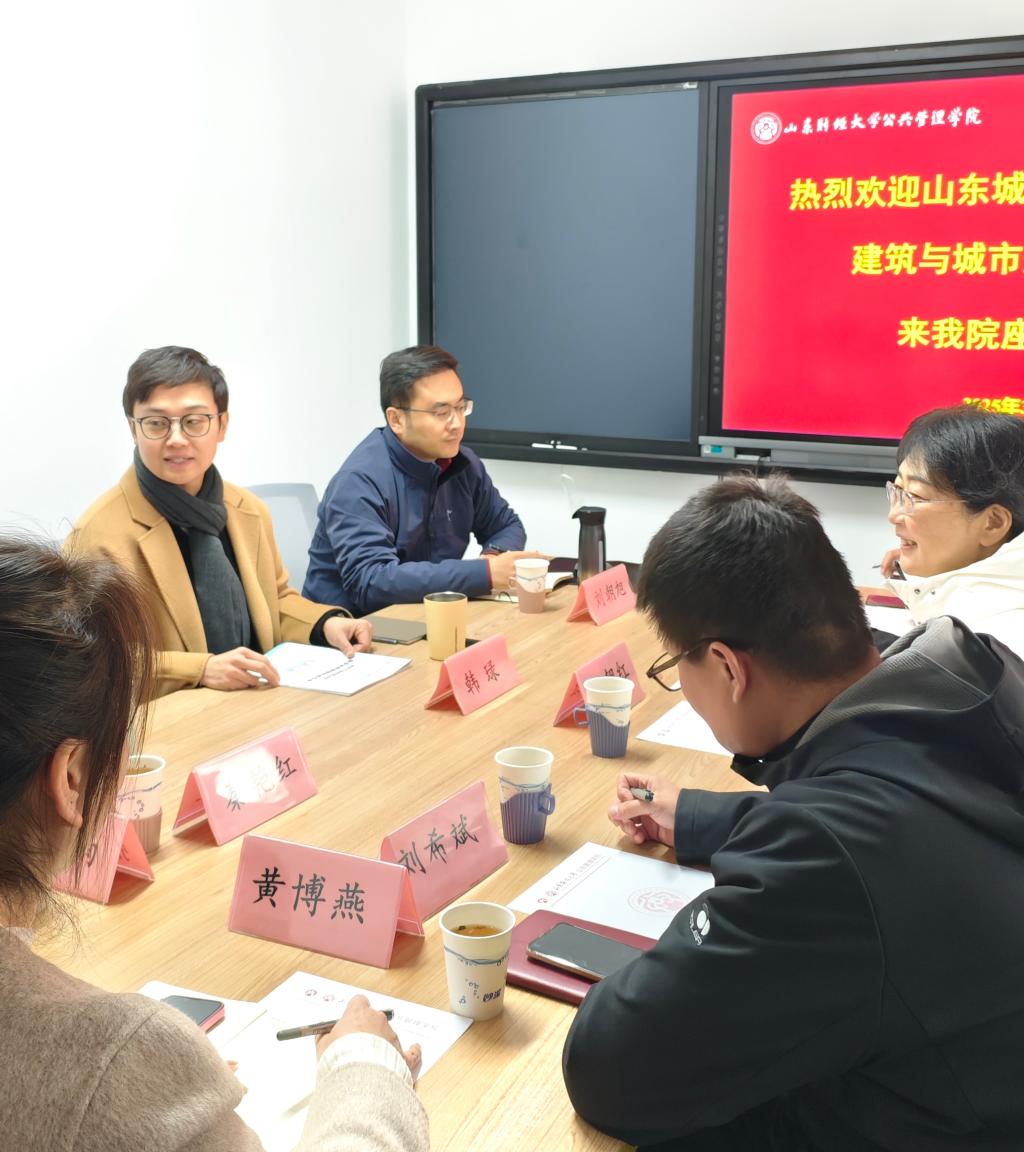 3月18日下午,山东城市建设职业学院建筑与城市规划系党总支书记邱朝红、副院长许念勇一行到访公共管理学院,开展座谈交流。城市与土地资源管理系主任韩琭、副主任刘朝旭及教师代表出席座谈会。