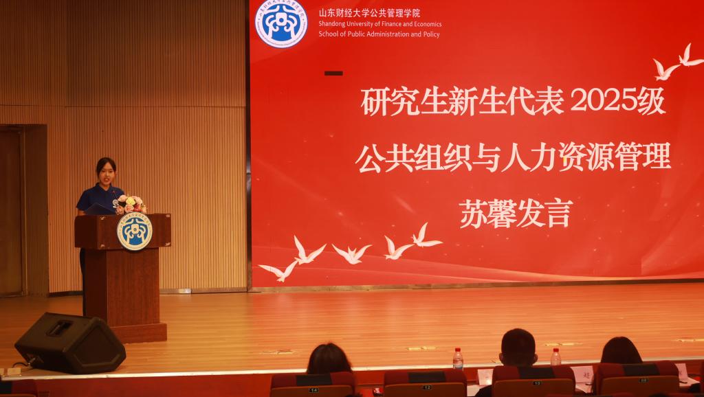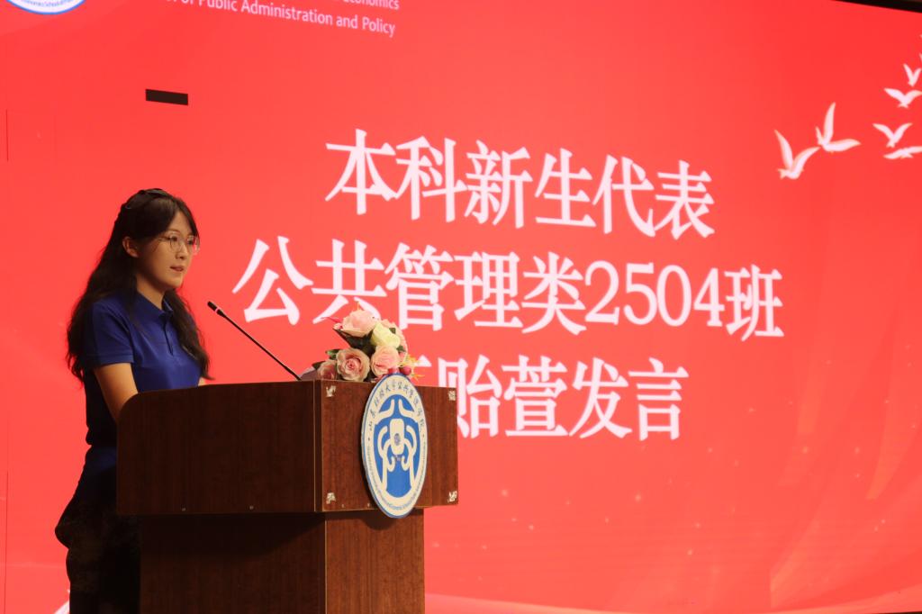 研究生新生代表、2025级公共组织与人力资源管理专业研究生苏馨、回顾了自己的考研历程,建议大家在研究生阶段做到潜心学习、勇于实践和协作创新,并结合社会实践经验,呼吁新生牢记青年使命、勇担时代责任。本科生新生代表、2025级公共管理类4班王贻萱表达了加入学院的欣喜与对未来的憧憬,并表示,大学阶段应以勤奋踏实为基,积极开拓未知,充分利用学院提供的理论与实践平台,主动参与志愿服务和社团活动,不断提升综合能力、涵养家国情怀。