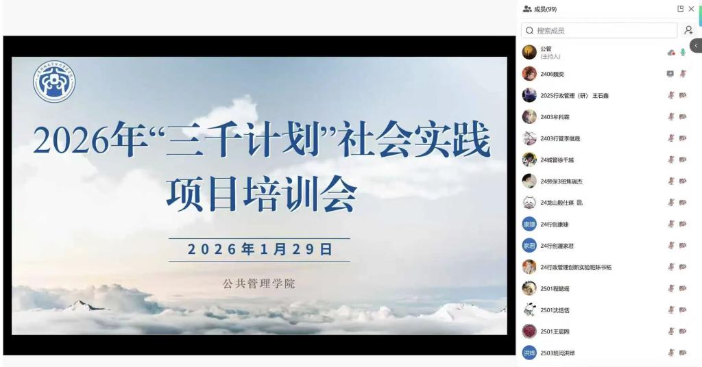 为切实提升学生社会实践能力,推动“三千计划”高质量实施,1月29日,公共管理学院召开“三千计划”社会实践调研培训会。学院党委副书记许薇、各系主任及教师代表参会,会议由学院团委书记王超主持。