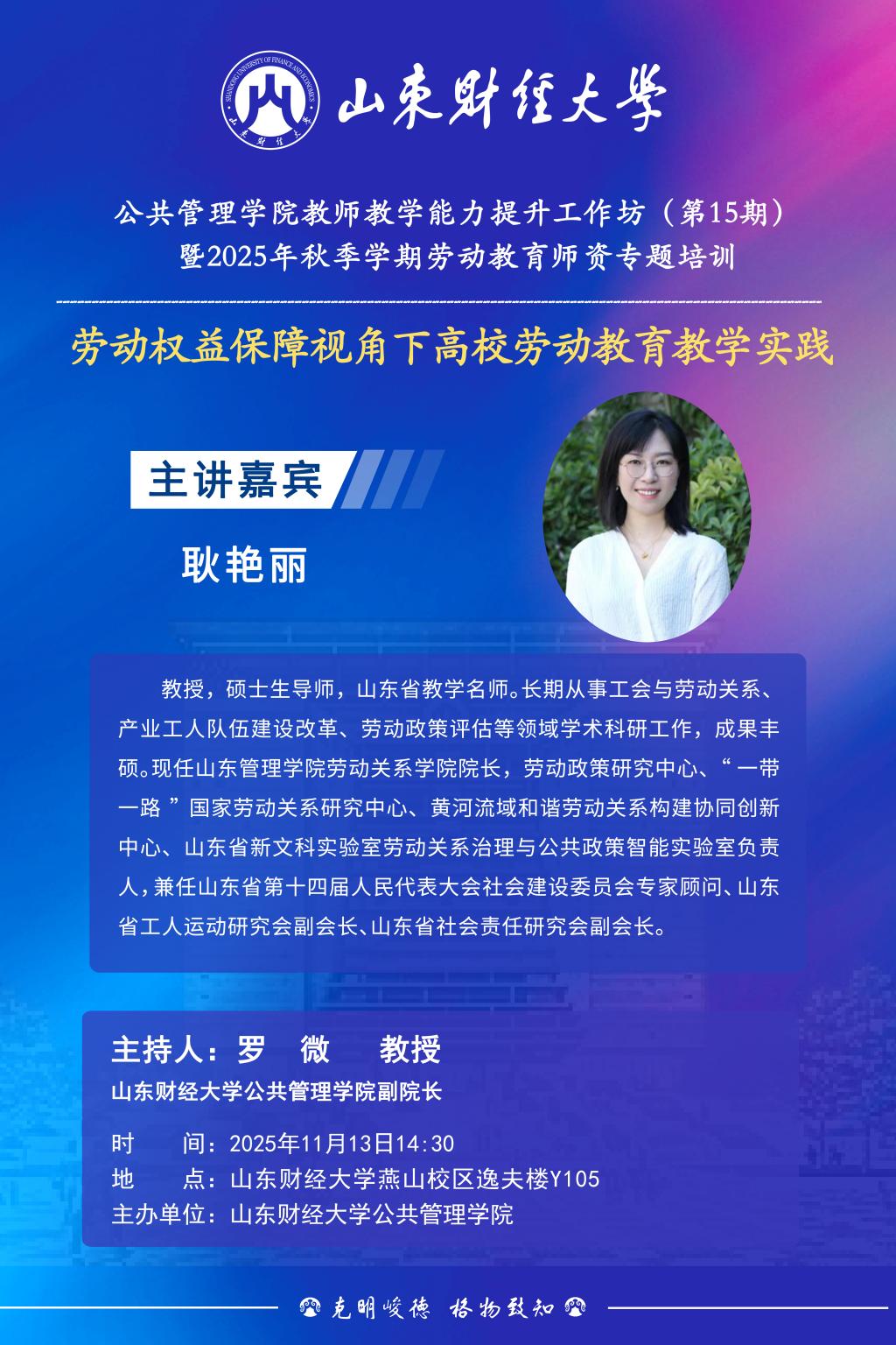 公共管理学院教师教学能力提升工作坊(第15期)暨2025年秋季学期劳动教育师资专题培训—劳动权益保障视角下高校劳动教育教学实践